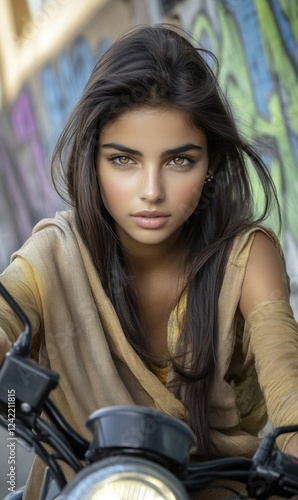 Beautiful Indian girl rider: motorcycle enthusiast, bold woman, sleek bike, dynamic journey, adventurous spirit, stylish appearance, fearless attitude, wind in hair, exhilarating ride.