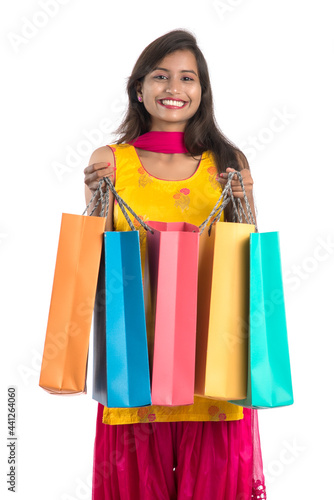 Beautiful Indian young girl holding and posing with shopping bags on a white background