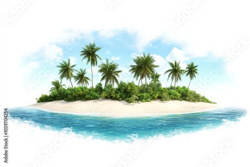 Beautiful island landscape with palm-fringed beach and crystal-clear water under a blue sky on solid white background
