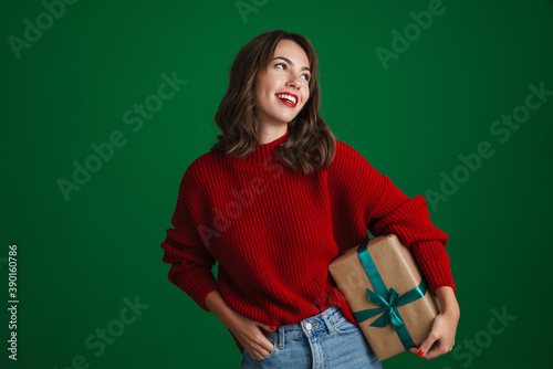 woman, people, girl, christmas, new year, holiday, celebration, present, gift, box, holding, posing, looking, smiling, joyful, cheerful, happy, pleased, lip, red, young, caucasian, brunette, isolated, green, background, copy space
