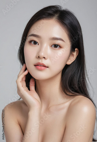 beautiful Korean girl good skin black hair white background skin care Hight detail