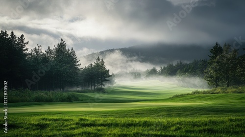 Beautiful landscape of a foggy golf course . Lush green grass and dark foggy cloud make this image amazing.