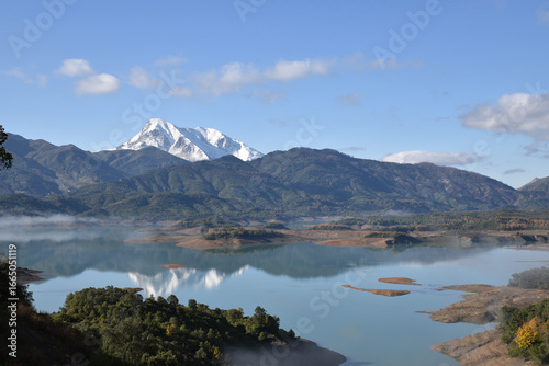 Beautiful landscape of lake and reflection of blue sky, clouds and mountains on surface of lake, Panoramic view of lake and snow-covered mountain and Forest trees calm in Jijel Algeria North African.
