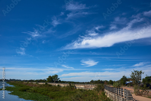 blue, sky, river, summer, winding, water, beautiful, landscape, nature, travel, green, park, rural, sunny, scenery, background, road, countryside, white, natural, colourful, bright, season, cloud