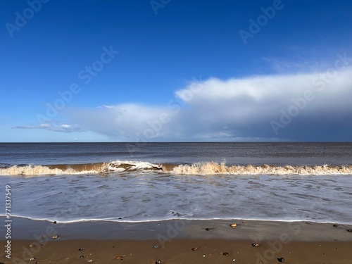 Beautiful landscape view of the vast sandy beach in Norfolk East Anglia uk with clear blue skies white cloud storm approaching calm rolling waves of sea and no people