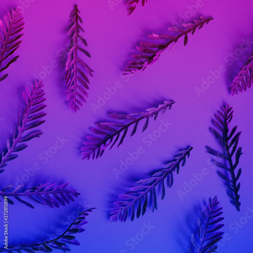 Beautiful leaves on a blue-pink background. Nature concept.