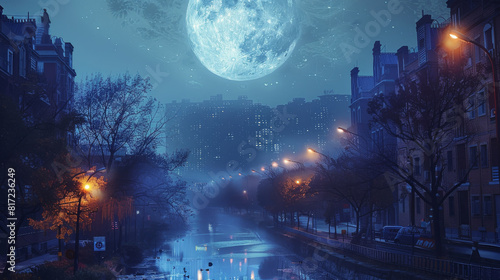 Beautiful lighting moon in modern city, majestic scene. Generative AI.
