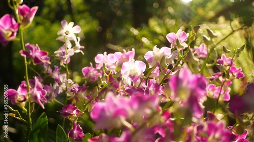Beautiful lilac purple and magenta orchids growing on blurred background of green park. Close up macro tropical petals in spring garden among sunny rays. Exotic delicate floral blossom with copy space