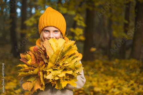 Beautiful little girl in bright yellow orange autumn warm knitted hat and scarf snood with bouquet of maple leaves,foliage walking in forest. Fun playing in park. Outdoor family activity in nature