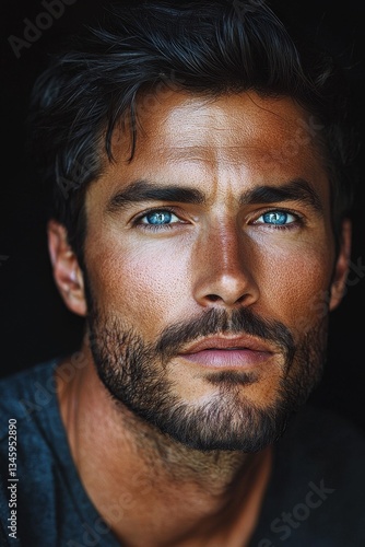 man, black hair, blue eye, beard, grey hair, skin, realistic, cinematic, style, confident, charismatic, portrait, closeup, facial hair, photogenic, adult, male, personality, beauty, unique, young, charming, handsome man, detail, elegance, fashion, attractive, person, expression, feature, modern, portraiture, charme, youthful, natural, stunning, quality, motion picture, scene