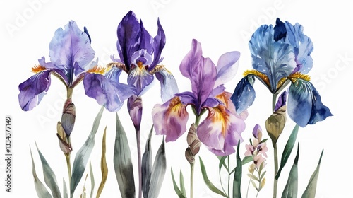 Beautiful Minimalistic Watercolor Floral Illustration of Iris Flowers for Invitation Cards and Botanical Art