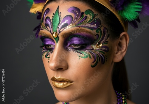 woman, make-up, carnival, mardi gras, face, paint, beauty, fashion, celebration, festival, costume, masquerade, party, portrait, glamour, colourful, purple, green, gold, bead, feather, headband, rhinestone, glistering, creative, artistic, elegant, stylish, festive, traditional, cultural, new, orleans, event, entertainment, holiday, fun, joy, excitement, beautiful, attractive, stunning, gorgeous, close, up, artist, vibrant