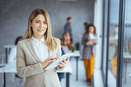 Beautiful modern businesswoman holding tablet computer with colleague on background. Confident stylish european mature business woman standing at workplace. Using digital tablet during a meeting.