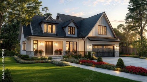 house, modern, architecture, landscape, garden, sunset, exterior, home, real estate, property, design, nature, flower, lawn, driveway, window, lighting