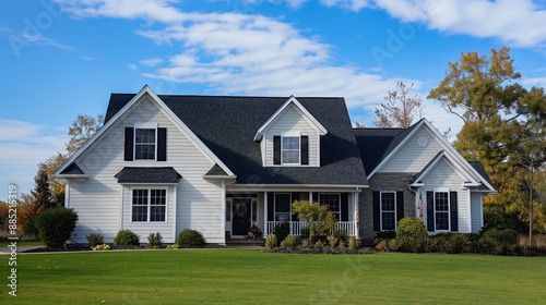 Beautiful modern suburban home with white siding, black shutters, and a large green lawn, surrounded by trees under a partly cloudy sky.
