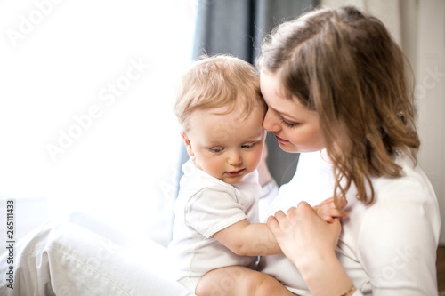 Beautiful mother and little son 9 months in the home interior. Cozy. Baby. Motherhood.