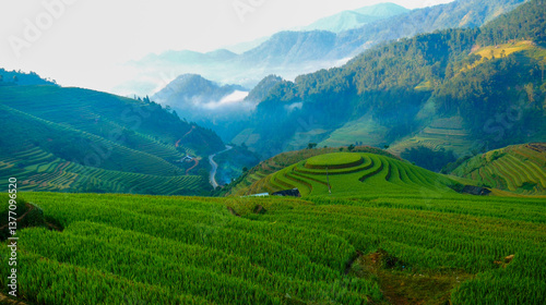 Beautiful Mountain landscape foggy windy mountain range green landscape asian farm. Amazing Landscape mountain green field meadow white cloud blue sky on sunrise. Countryside sunlight heaven scenery