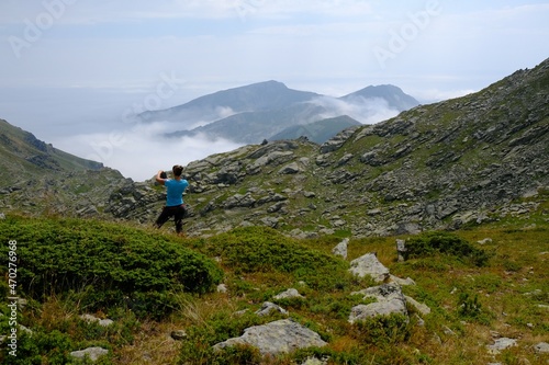 Beautiful mountain view above clouds during hiking on peak Djeravica (Gjerovica) - highest peak of Kosovo. Silhouette of woman taking photo on viewpoint. Albanian Alps, Peaks of Balkans