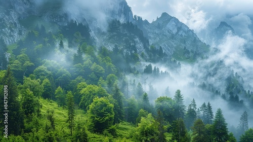 Beautiful mountain view with forests and rocks and fog