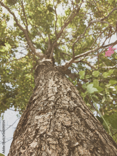 Beautiful natural background. Close-up bottom view of the tree trunk bark and branches. Vintage and faded matt style colour in tinted photo. Ideal for use in vertical design, wallpaper