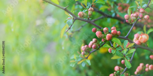 Beautiful nature spring background with a branch of blooming Quince. Blooming red Japanese quince , spring background