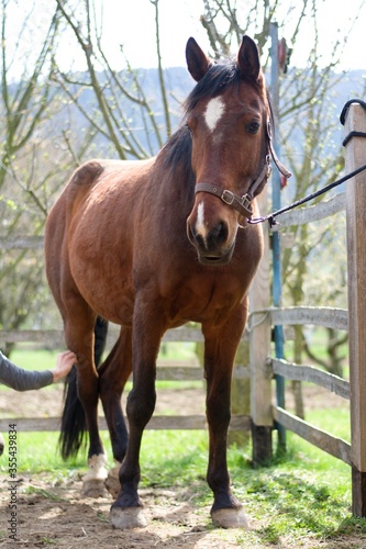 Beautiful old brown horse with halter tied to the wooden fence on the farm, girl take care about him.