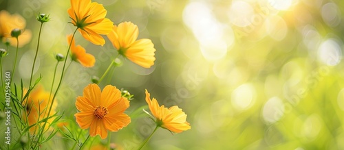 Beautiful orange cosmos flowers blooming in close-up against a blurred background in the morning sunlight, providing ample space for text.