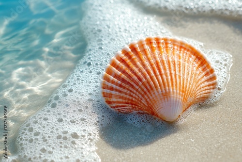 Beautiful orange scallop shell resting on sandy beach with gentle waves lapping at the shore in bright sunlight