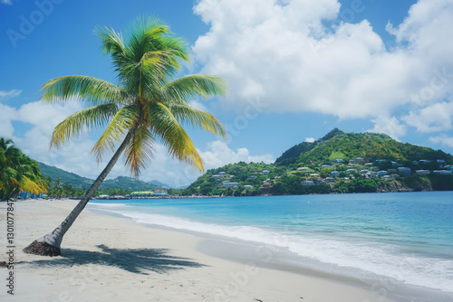 Beautiful palm tree on the beach with blue water and white sand in St. Vincent, a Caribbean country, close-up, with copy space for a travel, vacation, or summer trip concept.