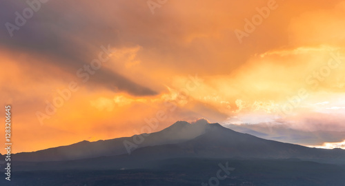 beautiful panorama of volcano mountain during evening synset with twilight clouds and shadows above majectic mountain and amazing cloudy sunset sky on background
