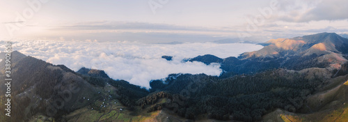 Beautiful panorama view to sunny mountains in Georgia. Bahmaro village location, near Svaneti region. Aerial shot above the clouds. Green hiils and big valley on the horizon. True nature.
