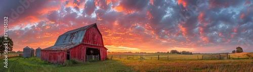 sunset, barn, red, countryside, rural, silos, sky, cloud, dramatic, landscape, nature, field, farm, agriculture, panoramic, evening, twilight, horizon, scenic, outdoors, rustic, tranquil, peaceful, vibrant, picturesque, farmland, summer, gold, light, dusk, serene, idylli, traditional, old, architecture, weathered, wooden, grass, fence, open, space