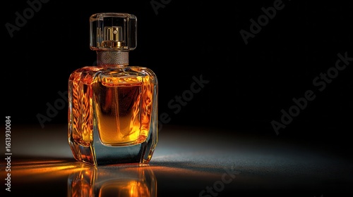 Beautiful photo of amber Perfume Bottle on Dark Reflective Surface.