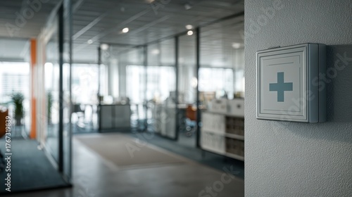 Beautiful photo of high-resolution close up of a first aid kit on an office wall, ultra-realistic photograph of a bright, modern office. The office is open, filled with natural.