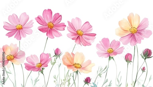 Beautiful pink cosmos flowers with a watercolor painting effect on a white background,