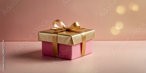 beautiful pink gift box on a pastel gold aesthetic background with space for text, concept for Birthday or Christmas or Valentines Day