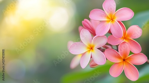 Beautiful pink plumeria flowers blooming in sunlight with blurred background