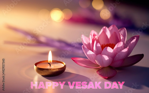 Beautiful Pink water lily with bokeh light and a glowing candle Concept of happy vesak day