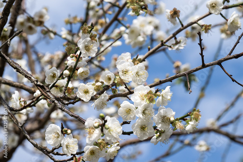 chinese plum, loquat tree, white, flower, flower, bloom, blooming, beautiful, beauty, flora, floral, plant, nature, garden, tree, winter, blue skies, closeup