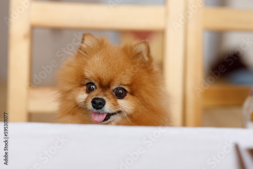 Beautiful pomeranian dog is sitting at a table playing and eating in a bright room.