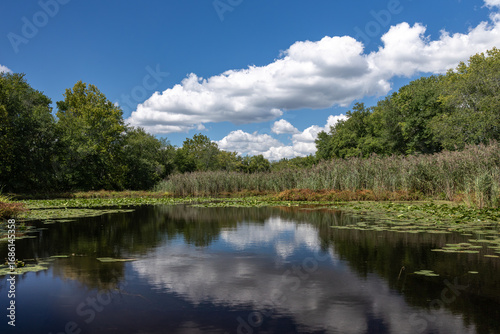 water, landscape, nature, summer, sky, forest, cloud, duck pond, green, tree, cloud, outdoors, grass, scenery, beautiful, scene