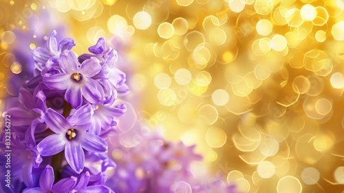 Beautiful purple hyacinth flowers close up with a golden bokeh background