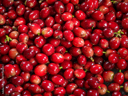 Beautiful red coffee cherries, lots of it, nature, colombian coffee in sunlight.