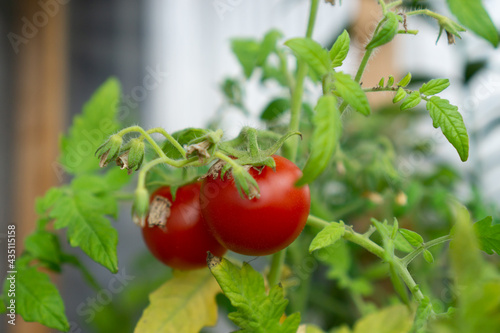 Beautiful, red, fresh cherry tomatoes Solanum lycopersicum grown in a greenhouse.