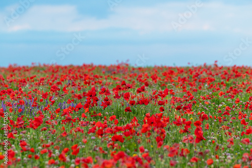 Beautiful red poppy field with blue sky