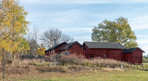 Beautiful red wooden farmhouse. House painted in traditional Swedish color.