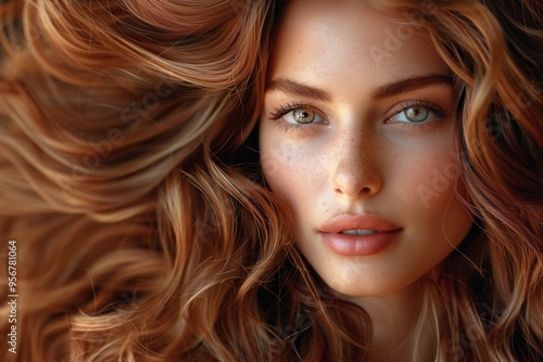 Beautiful redhead woman with luxurious, ginger hair extensions, volume, soft waves and a natural look. Beauty, hair care, and Hairdressing, Hairdresser Salon.
