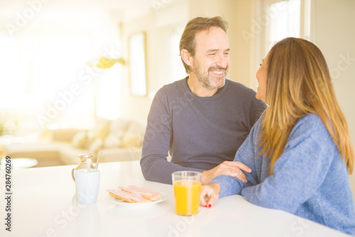 Beautiful romantic middle age couple having healthy breaskfast in the morning at home