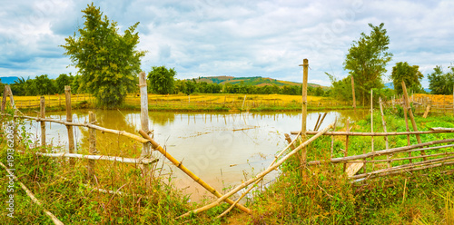 Beautiful rural landscape, pond on the foreground. Laos. Panorama