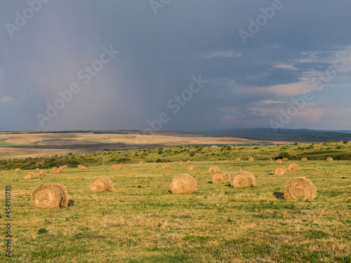beautiful rural landscape with rolls of hay on agricultural wheat field